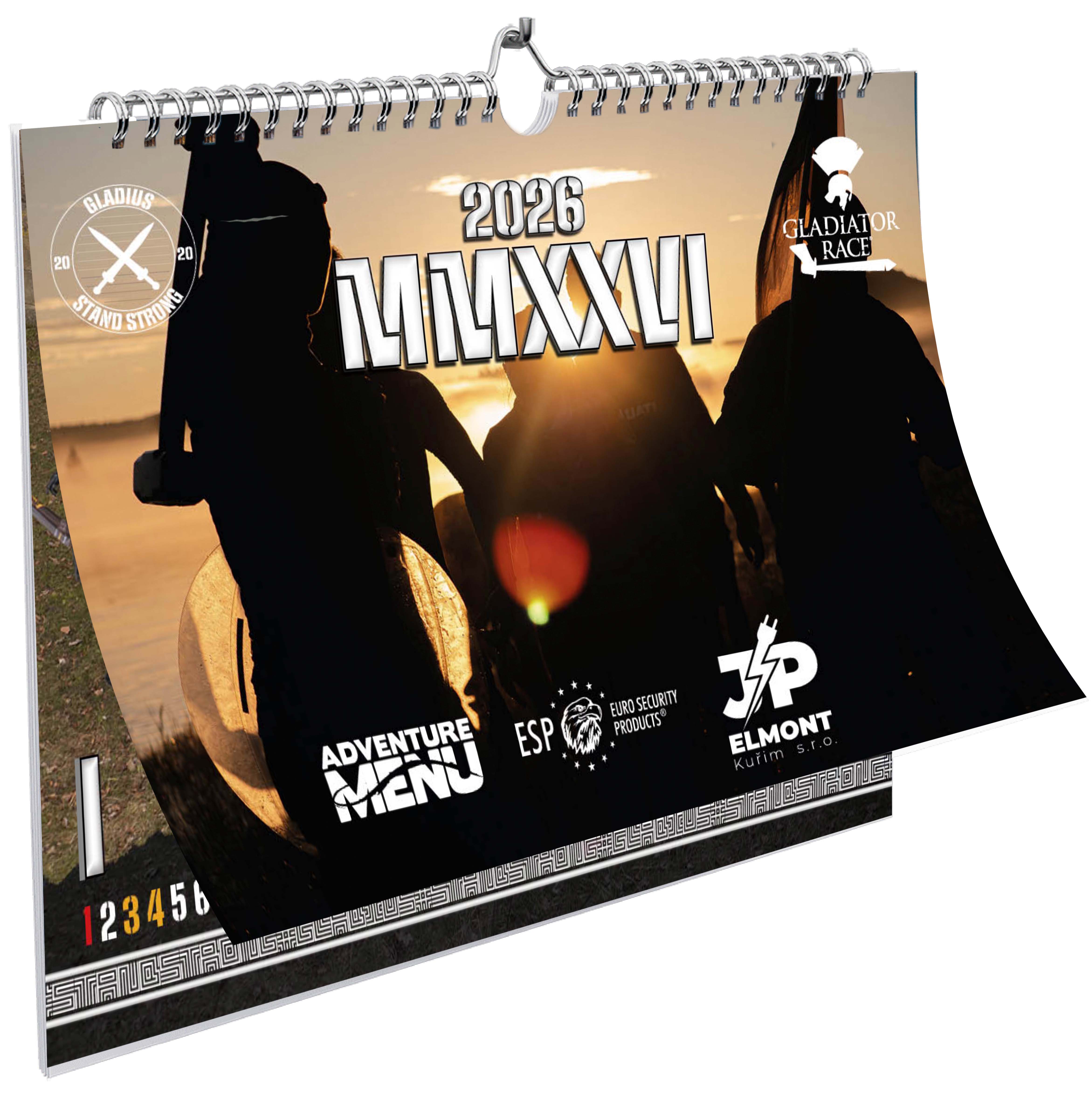 Velkoformátový A3 nástěnný kalendář Gladius 2026 zachycuje jedinečné okamžiky odvahy, týmové spolupráce a výzev, kterým účastníci čelili.